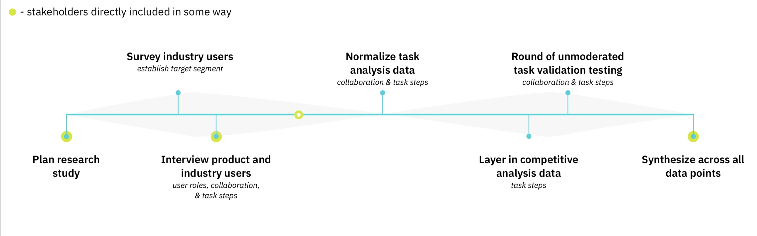 Key methods: Survey, interviews (moderated + unmoderated), task analysis (moderated + unmoderated), competitive analysis, validation testing.