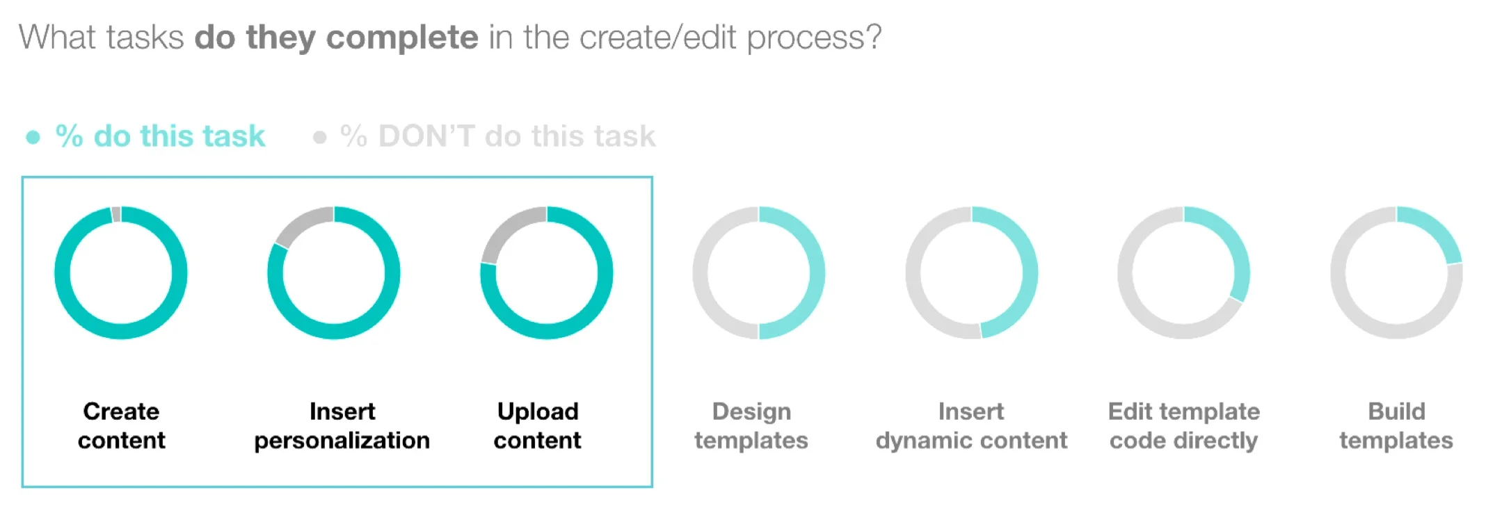 First, we defined our target segment. The team had been working from a single persona for years, but a persona which we lovingly referred to as suffering from multiple personality disorder. So we couldn’t start there. Our first step was to get a broad understanding of what kinds of people are involved in creating/editing marketing communications. We conducted a hybrid survey / unmoderated interview series in order to define those users. This allowed us to be more accurate with our user segmentation for the rest of the study.